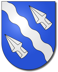 " D’azur à la bande ondée d’argent accostée de deux socs de charrue du même "